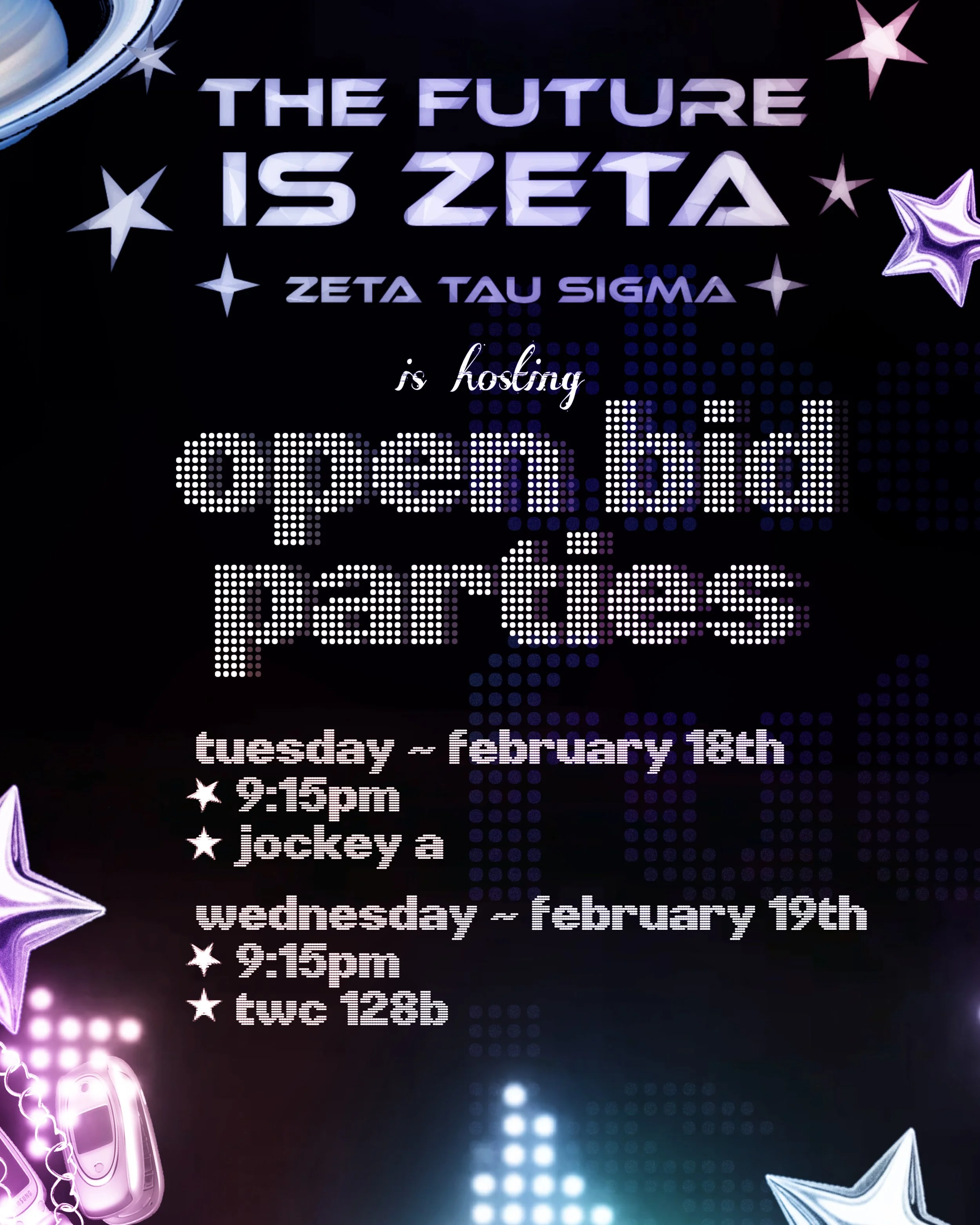 The following poster hung around campus informed the audience of the time and place of the events. The secondary display font gave a pixelated, cyber charm to fit the trending ‘Cyber Y2K’ aesthetic.
