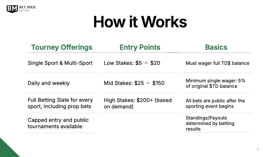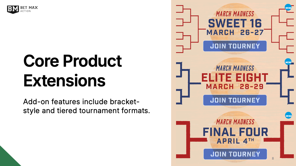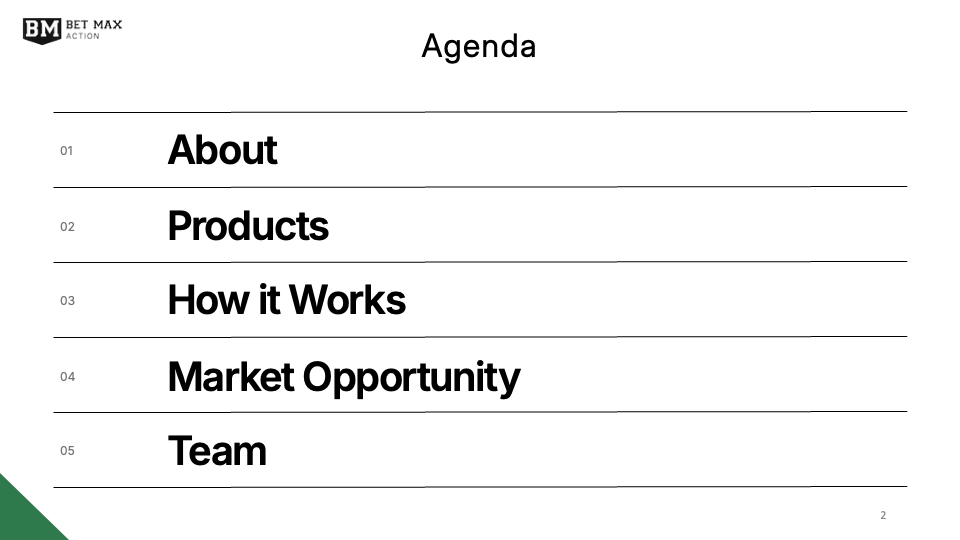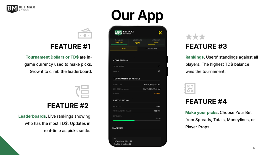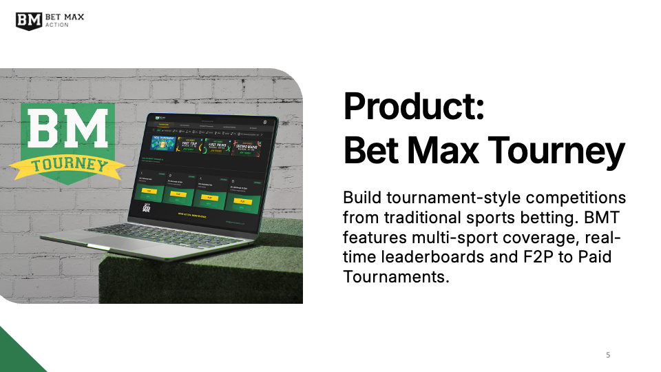 As a white label solution, Bet Max Action required a presentation to pitch their product, Bet Max Tourney. This deck explains BMT’s mission, features, and market opportunities using simple but effective visual aids. The application of balance, alignment, and Gestalt principles conveys trustworthiness and professionalism, while the use of negative space communicates prestige and simplicity.